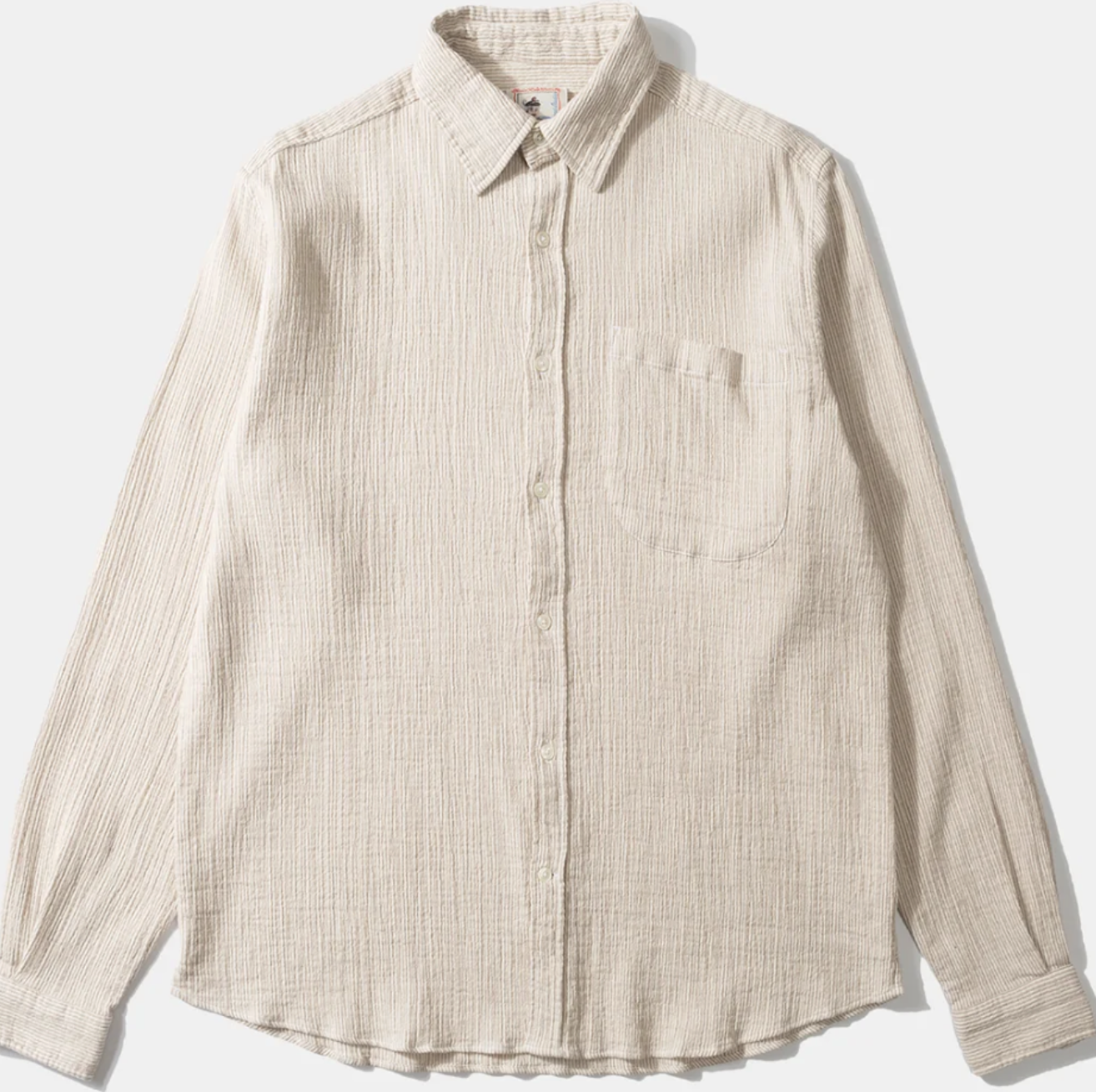 Chemise beige clair confectionnée en tissu de coton. Fermeture boutonnée et poignets ronds. Doux et confortable.