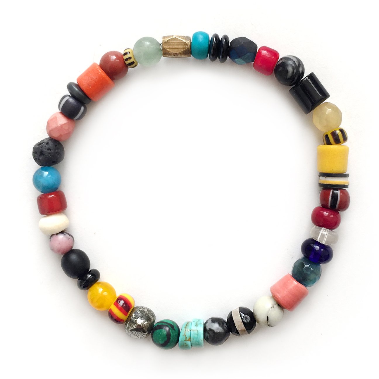 Ce bracelet de perles colorées peut être utilisé pour injecter une touche de couleur inattendue dans une tenue. Il est enfilé de jaspe, quartz, onyx, jade, turquoise, agate, perles de verre (vintage), perles de commerce, laiton antique et autres. Taille des perles 4 mm.