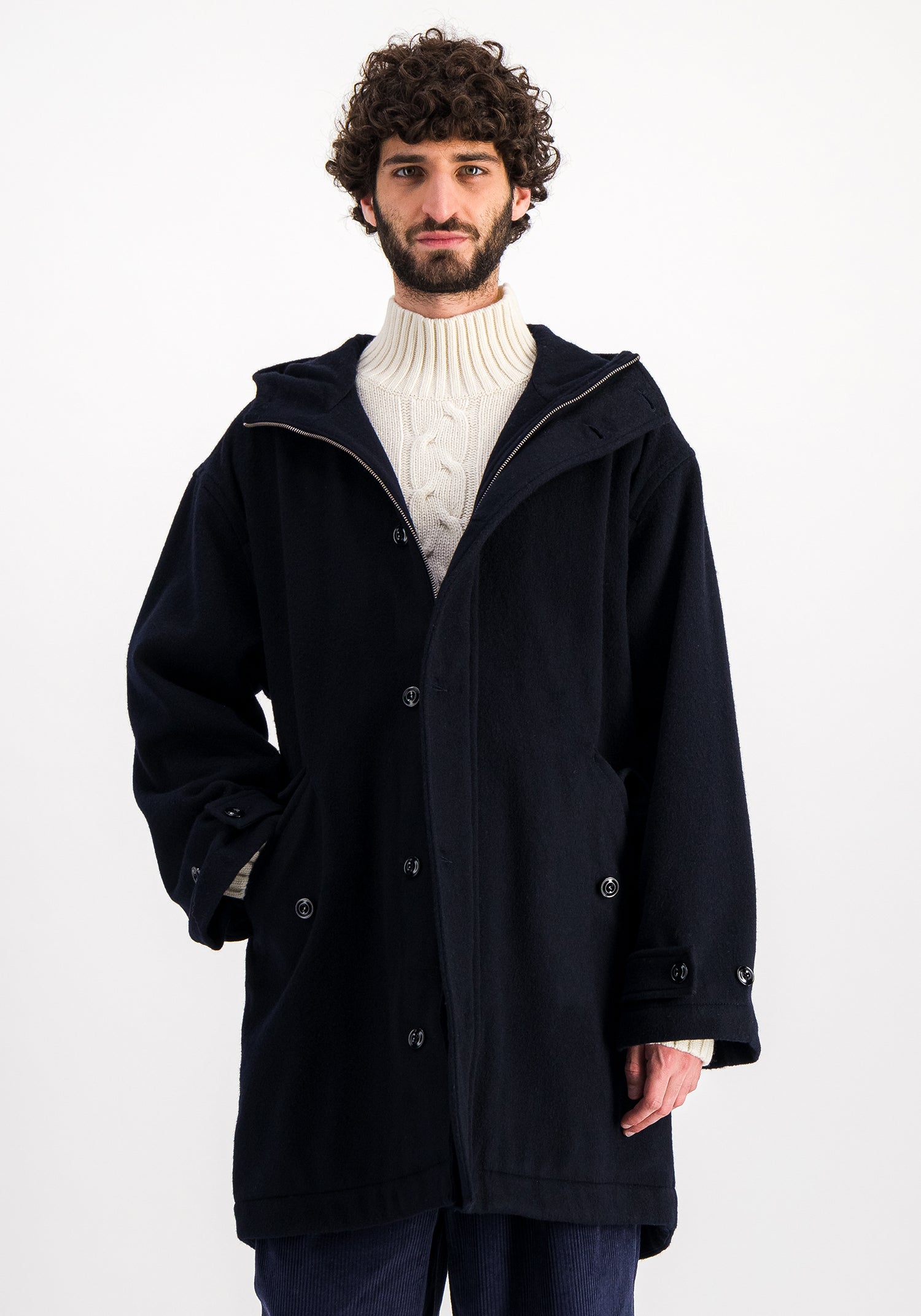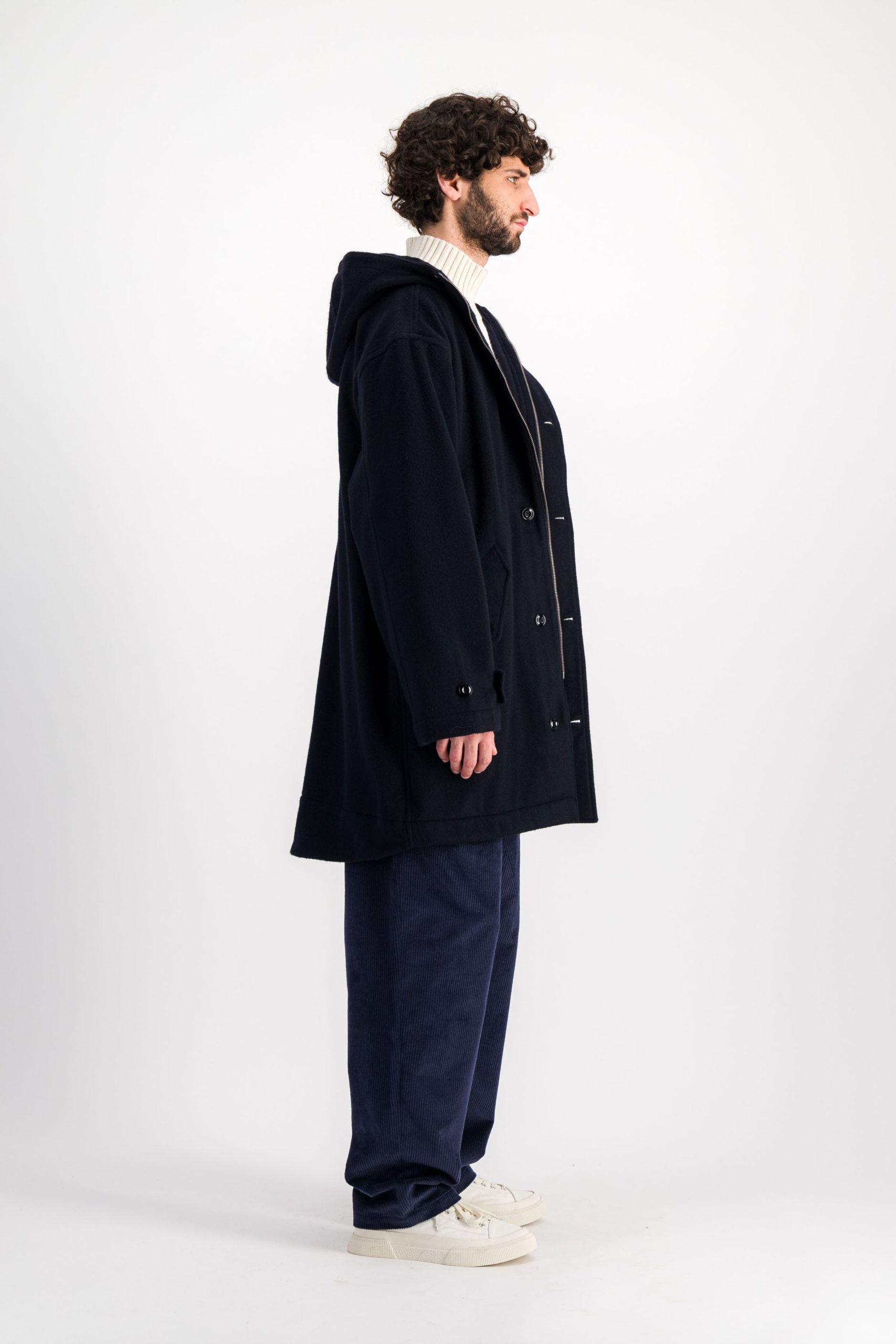 Manteau à capuche en drap de laine, avec système de fermeture hybride comprenant zip en métal et patte de boutonnage. Les poches extra larges sont largement assez grandes pour accueillir tous les indispensables du quotidien (portefeuille, clés, voire un livre). Le manteau n’a pas de doublure, mais toutes les coutures intérieures sont soigneusement terminées par un passepoil en coton de couleur écrue. La coupe est légèrement oversize, pour passer faciler par-dessus une veste ou une surchemise épaisse.