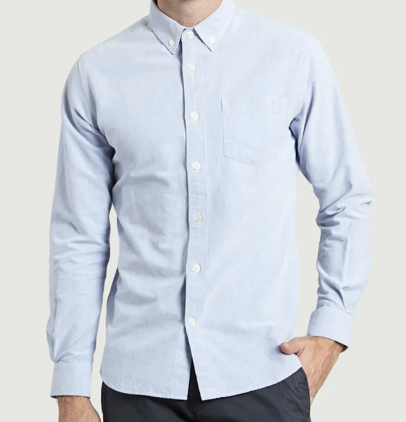 Chemise en coton biologique coloris encre, col américain, manches longues, poignets avec fente boutonnée, fermeture boutonnée à l’avant, poche poitrine plaquée, coupe slim.
